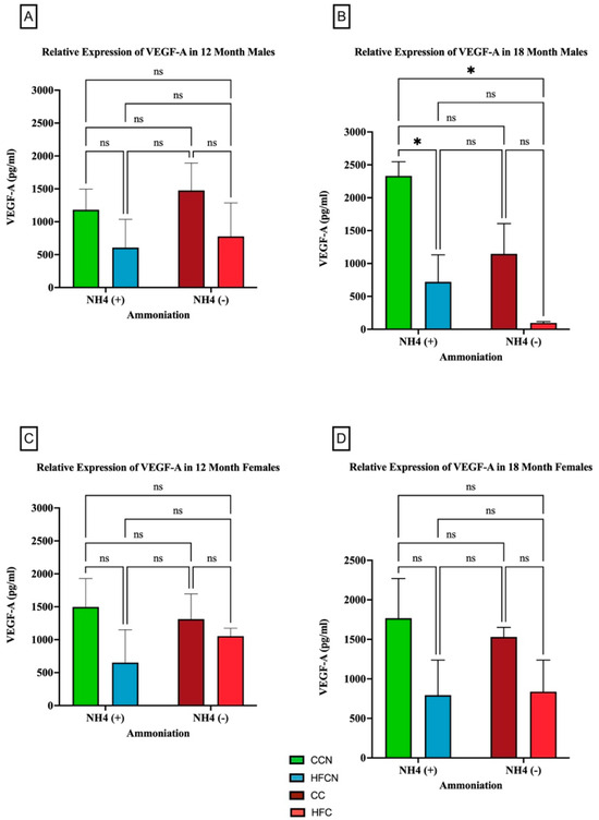 Comparison of the effects of dietary fat content on VEGF-A expression. VEGF-A protein levels were compared between sex and two different time points (12 months and 18 months) with respect to the effects of dietary protein source ±AHE. (A) Male mice at the 12-month time point. (B) Male mice at the 18-month time point. (C) Female mice at the 12-month time point. (D) Female mice at the 18-month time point. The colors represent diet groups as follows: green = HFCN, blue = HFCN, burgundy = CC, and red = HFC. Statistical significance is denoted by ns = no significance; * = p < 0.05.