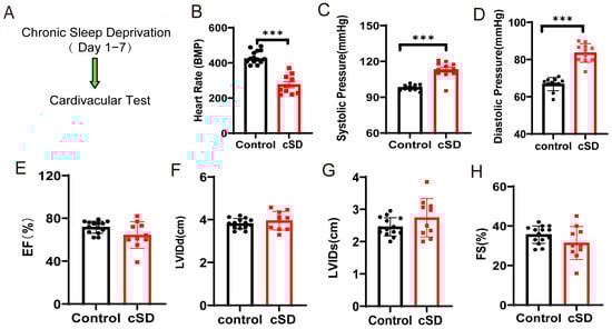 To assess whether cSD affected the heart rate, blood pressure, and left ventricular function, we subjected the mice to 7 days of cSD. Following the cSD, echocardiography was used to evaluate the heart rates, ejection fraction (EF), fractional shortening (FS), left ventricular internal diameter at systole (LVIDs), and left ventricular internal diameter at diastole (LVIDd) (Figure 1A). The blood pressure was measured through the carotid artery in vivo using an animal flowmeter. We found that the 7 days of sleep deprivation significantly decreased the heart rates (t(22) = 8.459, p < 0.0001; Figure 1B), increased the systolic pressures and diastolic pressures (t(22) = 6.547 or 9.063, both p < 0.0001; Figure 1C,D). However, the cSD did not affect the cardiac systolic function of mice. Neither the EF, nor LVIDd, nor LVIDs, nor FS were different between the control and the cSD group (Figure 1E–H).