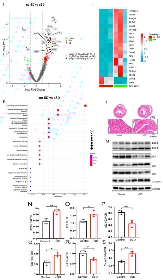 Chronic sleep deprivation (cSD) decreased the heart rate, increased blood pressure, changed the blood transcriptome, and enhanced the autophagy and apoptosis of cardiac tissue. (A) A schematic diagram of the experiment. (B) Comparison of the heart rates of mice between the control and cSD groups. (C,D) Blood pressure was measured through the carotid artery in vivo using an animal flowmeter. A comparison of the systolic and diastolic pressure of mice between the control and cSD groups is displayed. The comparisons of EF (E), LVIDd (F), LVIDs (G), and FS (H) between the control and cSD groups were separately calculated. The heart rates, EF, LVIDd, LVIDs, and FS were measured using echocardiography. (I) Volcano plots showing differentially expressed genes (DEGs) in comparisons of blood from no-SD and SD mice. Vertical dashed lines denote fold-change thresholds (|log2FC| = 1); the horizontal dashed line denotes the p adjust threshold (p < 0.05). (J) Heat map showing fold changes of top 20 genes between no-SD group and SD group. The color red represents a high level of gene expression, while the color blue indicates a low level of gene expression. (K) GO analysis of differentially expressed genes (DEGs) in SD compared with no-SD. The top 20 ranked GO biological processes, molecular functions (MFs), and cellular components (CCs) are shown. (L) Hematoxylin and eosin (H&E) images of crosscut section of the heart from control and cSD mice (scale bar = 1 mm or 100 μm). (M–S) Representative western blot image and quantification of LC3-I, LC3-II, p62, Bax, Bcl2, and c-Cas-3 SOD2 in control and cSD mouse hearts (n = 3/group). For 1B–H, the significance of the difference between groups was determined using independent t-test (control, n = 14, cSD, n = 10). Vertical bars represent the mean ± the SEM. Asterisks indicate significant differences from the relevant controls, (* p < 0.05, ** p < 0.01, *** p < 0.001, two-tailed t-test for (P–S)).