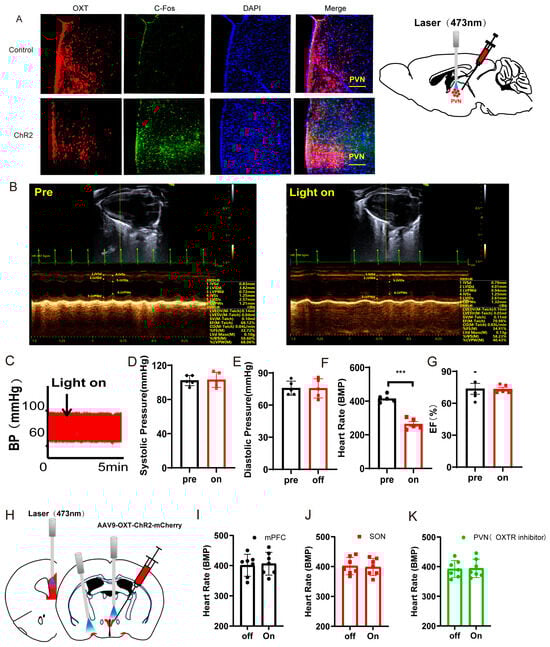 According to earlier research, PVNOXT neurons may have a role in controlling the cardiovascular system []. Next, we looked into how heart rate, blood pressure, and left ventricular function were affected by optogenetic activation of PVNOXT neurons. Representative immunohistochemical staining pictures showed that the AAV-OXT-hChR2-mCherry virus was injected into the PVN (Figure 2A, left panel). Optogenetic stimulation of OXT neurons was carried with a 473 nm laser (Figure 2A, right panel). Optogenetic activation of PVNOXT neurons increased c-Fos expression in AAV-OXT-ChR2-mCherry-expressing neurons, which proved the effectiveness of the virus (Figure 2A). To further determine the specificity of AAV9-OXT-ChR2-mCherry expression in the oxytocin neurons, we injected the AAV-AVP-hChR2-mCherry virus into the PVN. Unlike the functions of oxytocin neurons, activation of arginine vasopressin neurons did not affect the heart rates but increased both the systolic and diastolic pressure, which indirectly proved the specificity of the AAV9-OXT-ChR2-mCherry virus (Figure S1).