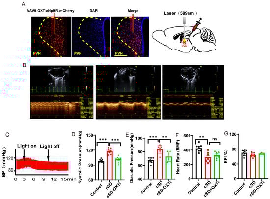 The PVN is essential for regulating the cardiovascular system. The PVN includes neuroendocrine (neurosecretory) and autonomic compartments, both of which are important for regulating osmotic homeostasis and blood pressure [,,]. In the PVN, neurosecretory magnocellular neurons are the primary source of oxytocin []. Additionally, neurosecretory parvocellular neurons have a role in stress responses and the functioning of the hypothalamic–pituitary–adrenal axis [,]. Furthermore, the PVN, an autonomic master controller of the cardiovascular system, is essential for the autonomic adaptation of blood pressure to external stressors and causes blood pressure variability []. Chronic stimulation of hypothalamic oxytocin neurons attenuated the development of hypertension following an additional four weeks of chronic intermittent hypoxia exposure (CIH) [], indicating that PVN contributed to CIH-induced exaggerated cardiovascular responses [,,,]. In hypertensive animals exposed to CIH, activation of PVN oxytocin neurons decreased heart rate but facilitated faster heart rate recovery time following exercise. In the CIH model, decreased heart rates induced by the oxytocin neurons could help animals reduce oxygen consumption, which thus played a protective role in the cardiovascular system. However, the PVN oxytocin’s role in the cardiovascular system following cSD is not yet fully elucidated.