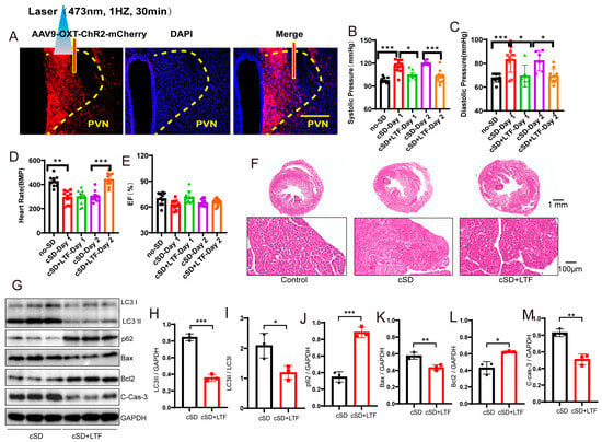 Previous studies have found that long-time inflammation could be detrimental to the heart []. We thus speculate that cSD-induced disorder of the immune system and increased mPST release could lead to abnormal cardiovascular responses, such as morphological structure change of myocardial cells and autophagy and apoptosis of cardiac tissue. LTF stimulation of PVNOXT neurons could reverse the cSD-induced increase of mPST release, thus improving the morphological structure of myocardial cells and the autophagy and apoptosis of cardiac tissue induced by the cSD. Our research will help attract more similar studies and provide foundations for researching cSD-induced cardiovascular diseases.