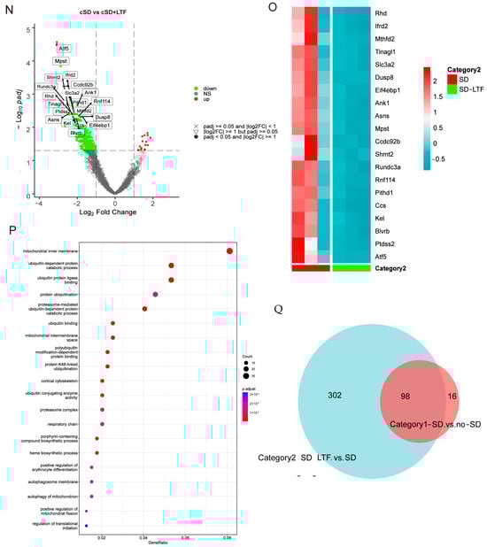 To identify the molecular factors underlying the change in blood pressure and heart rates induced by the cSD, both no-SD and SD mice were subjected to RNA-seq analyses. We interrogated transcriptional changes in the adult mice’s blood after chronic sleep deprivation. Genes with p adjust < 0.05 and fold change ≥ 1 were regarded as differentially expressed genes (DEGs). Seven days of cSD induced extensive alterations to the blood transcriptome in comparison to no-SD controls, as illustrated by the heatmap of the fold-changes between the SD group and the no-SD group (Figure 1I,J). In male mice, this resulted in 114 genes that were differentially expressed (105 upregulated and 9 downregulated). The genes that we found to be significantly upregulated due to chronic sleep deprivation were Atf5, mPST, Mthfd2, Slc7a5, Shmt2, and Rexo2 (Figure 1J). Collectively, cSD increased genes involved in cellular metabolism (Mthfd2, Slc7a5, and Shmt2) and maintenance of mitochondrial homeostasis (Atf5 and Rexo2). Chronic sleep deprivation downregulated the level of immune-related genes (Cd79b and lghm). We next performed a functional analysis for each differentially expressed gene (Figure 1K) and found that these genes were mainly enriched in biological functions such as cell structure and catabolism. Furthermore, compared to the control groups (no-SD), the functional annotation network illustrated the biological and molecular roles of pathways modified by cSD. These results indicated that cSD enhanced the inflammatory and cellular stress responses.