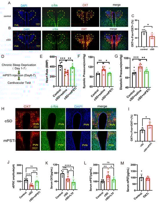 The increased mPST release from the peripheral blood was associated with reduced excitability of PVNOXT neurons and abnormal cardiovascular response following cSD. (A,B) Co-staining of PVNOXT neurons with OXT antibody (red), c-Fos antibody (green), and DAPI (blue). Scale bars, 100 μm. (C) Statistical analysis results of slice pictures taken with confocal fluorescence microscopy showed the percentage of c-Fos-positive neurons in OXT-positive neurons in the control and cSD group (n = 5 mice). (D) A schematic diagram of the experiment (mPSTi, mPST inhibitor) (E) A comparison of the heart rates of mice between different groups is shown. (F,G) A comparison of the systolic diastolic pressure of mice between different groups is displayed. (H) Co-staining of PVNOXT neurons with OXT antibody (red), c-Fos antibody (green), and DAPI (blue). Scale bars, 200 μm. (I) Statistical analysis results of slice pictures taken with confocal fluorescence microscopy showed the percentage of c-Fos-positive neurons in OXT-positive neurons in the cSD and cSD + mPSTi group (n = 5 mice). (J) The peak amplitudes of the evoked excitatory postsynaptic currents (eEPSC) in diffirent groups (n = 6 mice). The serum OXT (K) and mPST (L,M) were measured by ELISA kits. Vertical bars represent the mean ± the SEM. Asterisks indicate significant differences from the relevant controls (ns p > 0.05, * p < 0.05, ** p < 0.01, *** p < 0.001, **** p < 0.0001, independent t-test for (C, I) and (M); one-way ANOVA for (E–G) and (K,L)).
