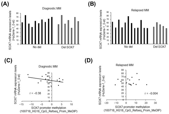 3.3. Deletion and Promoter Methylation of SOX7 Tend to Occur in Different MM Cases