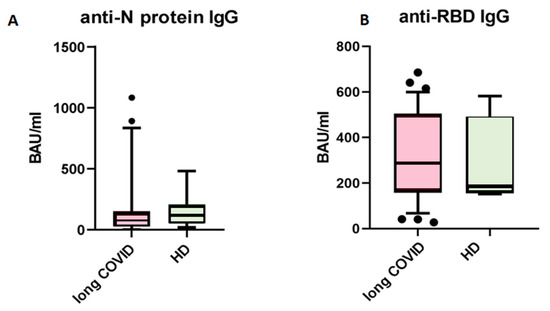 Comparison of circulating IgG antibodies in blood plasma of patients with long COVID (n = 63) and healthy donors with no symptoms of long COVID (n = 47). (A) anti-N protein IgG; (B) anti-RBD IgG. No statistical differences were found via Mann–Whitney U-test. The Y axis presents BAU/mL, the central line stands for median, and the whiskers are at 10–90 percentiles.