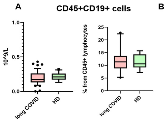 Comparison of CD45 + CD19+ lymphocytes in the whole blood of patients with long COVID and healthy donors (HDs). (A) Comparison of absolute counts (cells × 109/L); (B) comparison of percentages (from CD45% lymphocytes). No statistical differences were found via Mann–Whitney U-test. Box represents median and Q25–Q75. Bars stand for the 10–90 percentile.