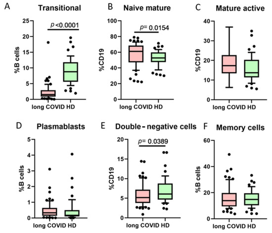 Comparison of B cell minor subsets based on CD27/CD38 co-expression in long COVID patients and healthy donors (HDs). (A) Transitional cells (CD27−CD38++), (B) naive mature cells (CD27−CD38+), (C) mature activated (CD27+CD38+), (D) plasmablasts (CD27+++CD38++), (E) double-negative (CD27−CD38−), (F) memory cells (CD27+CD38−). Box represents median and Q25–Q75. Bars stand for the 10–90 percentile.