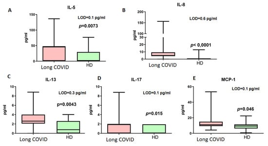Cytokine concentrations (pg/mL) in blood plasma of long COVID patients (Long COVID) and healthy donors (HDs). Only cytokines demonstrating statistically significant differences are presented ((A) IL-5, (B) IL-8, (C) IL-13, (D) IL-17, (E) MCP-1). LOD—limit of minimal detection according to manufacturers’ manual. Box represents median and Q25–Q75. Bars stand for min and max values.