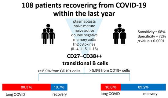 Finally, we analyzed all the abovementioned markers in terms of classification analysis to determine what has the most prominent impact on the development of long COVID symptoms. For that, we used a QUEST decision tree analysis, which demonstrated that out of all the assessed parameters, the percentage of cells with phenotype CD27−CD38++ (transitional) is effective in terms of post-COVID prognosis (Figure 5). In 83.3% of cases, CD27−CD38+++ ≥ 5.94% allowed the model to classify the patients into a ‘long COVID’ group.