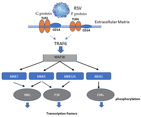 Toll-like receptor (TLR) stimulation by RSV leads to the activation of MAPK signaling pathways and the transcriptional regulation of TLRs, as well as inducing an array of transcription factors, such as Interferon Regulatory Factor 3 (IRF3), Interferon Regulatory Factor 7 (IRF7), NF-κB, c-Jun, and Activator Protein-1 (AP-1), which translocate to the nucleus and initiate the transcription of various proinflammatory cytokines. It has been shown that ERK activity is required for RSV-induced interleukin-8 (IL-8) production in airway epithelial cells, and ERK activity is required for lipopolysaccharide (LPS)-induced TNFα [15]. The inhibition of p38 MAPK impacts the virus–host interaction, and p38 MAPK affects the inflammatory response associated with the expression of proinflammatory molecules [16,17,18]. Interestingly, one study showed that RSV activates p38 MAPK in a Toll-like 4 (TLR4)-mediated manner during the early stage of infection, utilizes p38 MAPK for replication [19], and sequesters the NF-κB p65 subunit in cytoplasmic inclusion bodies to inhibit innate immune signaling [20]. Also, ERK activation and transport of RSV F protein to the plasma membrane has been described [21], and it has been shown that the phosphorylation of the RSV small hydrophobic (SH) protein occurs via a MAPK p38-dependent pathway [22]. Thus, components of the MAPK pathway regulate gene expression and function, and viruses have taken advantage of this pathway to aid their replication and/or preclude antiviral responses. These findings are consistent with the critical role of MAPK in regulating the host response to virus infection and the numerous inflammatory mediators/cytokines expressed in response to RSV infection. Typically, disease pathogenesis following infection is a multifactorial process involving virus replication, innate responses to infection, and aberrant adaptive immune responses that can be linked to modification by RSV proteins. The early onset of RSV disease severity suggests that features affecting innate immunity have an essential role in the disease process, and it is likely that these features are linked to RSV activation of pattern recognition receptors (PRRs)/TLRs [23].