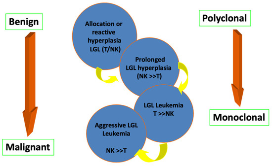They are divided into reactive and monoclonal, transient (<6 months) and chronic (>6 months) [13,14,15,16] (Figure 1). There is considerable overlap in the spectrum of clinical manifestations and laboratory findings between monoclonal (such as T-LGL leukemia) and reactive lymphoproliferative disorders from cytotoxic T lymphocytes which, as mentioned above, coexist with various clinical conditions.