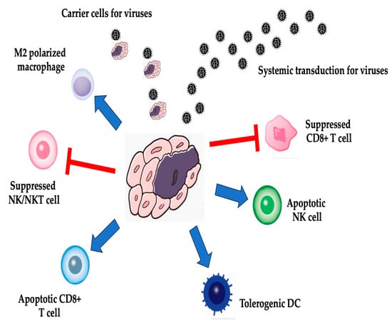 Cancer gene therapy is attracting a lot of attention as a new treatment method to overcome intractable cancers [76]. Oncolytic viruses are naturally occurring or genetically engineered viruses that selectively replicate and spread within tumor tissue, destroying it without causing undue damage to normal tissue [71,77]. Oncolytic virus therapy using these viruses is classified as in vivo gene therapy, the direct introduction of genes into the body for cancer [70,78,79]. Oncolytic viruses can remodel the TME and stimulate antitumor immune responses through various mechanisms. In interactions with immune cells, oncolytic viruses can enhance the infiltration and activation of immune cells such as natural killer (NK) cells, CD8+ T cells, and dendritic cells (DCs) within the TME [80,81]. They reduce immunosuppressive cells such as regulatory T cells and myeloid-derived suppressor cells, thereby overcoming immune suppression in the TME [81,82]. Oncolytic virus infection causes the immunogenic cell death of tumor cells, releasing tumor-associated antigens and danger signals that activate DCs and prime antitumor T cell responses [80,82]. In the expression of immunomodulatory molecules, oncolytic viruses can be engineered to express immunostimulatory cytokines, chemokines, or tumor antigens that further enhance antitumor immunity [80,82,83]. By overcoming immunosuppressive pathways, oncolytic viruses can counteract immunosuppressive mechanisms such as the indoleamine 2,3-dioxygenase (IDO)–kynurenine–aryl hydrocarbon receptor (AhR) pathway in the TME, allowing for better immune cell activation [84]. The following are crucial for successful oncolytic virotherapy: (i) the efficient delivery of oncolytic viruses to the TM, (ii) the robust replication and spread of oncolytic viruses within the tumor bed, causing oncolysis and the release of immunogenic signals [80,84], and (iii) the activation of potent innate and adaptive antitumor immune responses by the oncolytic virus, acting as an in situ immunotherapeutic agent [80,81,82]. Thus, OVs can transform the immunosuppressive TME into an immunostimulatory environment through direct oncolysis, the expression of immunomodulatory molecules, and interactions with various immune cell populations, leading to potent antitumor immunity [80,81,82,83,84].