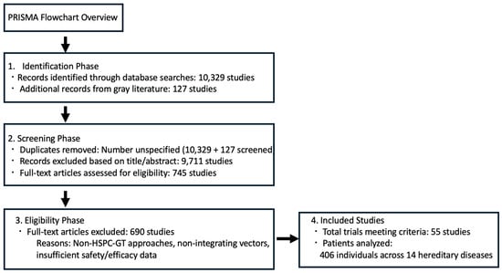 A PRISMA (Preferred Reporting Items for Systematic Reviews and Meta-Analyses) flowchart for gene therapy in hereditary diseases can be constructed based on a systematic review of hematopoietic stem/progenitor cell gene therapy (HSPC-GT) trials from 1995 to 2020 (Figure 3) [307]. This flowchart highlights the rigorous selection process and safety/efficacy outcomes in hereditary disease gene therapy trials, emphasizing the superior safety profile of lentiviral vectors [307].