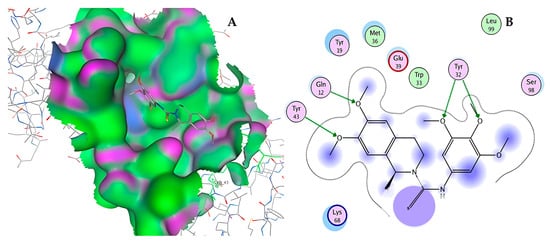 The three-dimensional structure of the HPV16 E2 TAD was obtained from the Protein Data Bank (PDB, www.rcsb.org accessed on (13 December 2024)). The structure was then prepared for virtual screening by removing the water molecules, adding hydrogen atoms, and assigning partial charges using the Gasteiger method. This method estimates partial charges based on the partial updates of electronegative orbitals. The molecular recognition site was identified using the Site Finder application included in the MOE software version 2022.02 (Chemical Computing Group Inc., Montreal, QC, Canada) suite [].