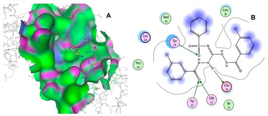 Interactions between compound 10756 and TAD binding cavity of HPV16 E2 protein. (A) Docking pose of compound 10756 within transactivation domain (TAD), showing its orientation in binding pocket surface, in close contact with central region of cavity. (B) Two-dimensional interaction map depicting hydrogen bonds formed between compound 10756 and residues Tyr19, Tyr43, Gln12, and Glu39. These residues are functionally relevant in E2-E1 interface and contribute to stabilization of ligand. Residue types are color-coded: red-circled residues are negatively charged, blue-circled residues (Lys68) are positively charged, green-circled residues (Met36, Leu16, Ile15) are nonpolar/hydrophobic, and pink or purple circles denote polar uncharged residues.
