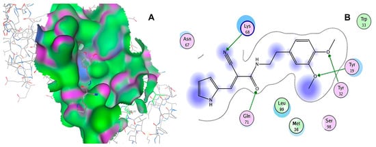 The interactions between compound 10726 and the TAD binding cavity of the HPV16 E2 protein. (A) The docking pose of compound 10726 within the transactivation domain (TAD), showing its position nestled in the central region of the cavity surface. (B) A two-dimensional interaction map illustrating hydrogen bonds between the compound and the residues Gln71, Leu99, Tyr19, and Tyr32. These residues play important roles in protein–protein recognition, particularly in the E2-E1 interaction. The residues are color-coded according to their chemical natures: polar uncharged residues are shown in pink; positively charged residues are marked in blue; and hydrophobic residues appear in green.