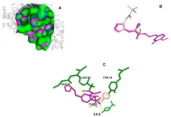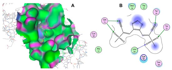 Figure 1 shows the structure of the transactivation domain (TAD) of the HPV16 E2 protein, obtained from the Protein Data Bank (PDB-ID: 1DTO) []. A computational surface analysis of the protein was performed using the Site Finder application in the MOE software version 2022.02 (Chemical Computing Group Inc., Montreal, QC, Canada). This tool utilizes an algorithm to identify concave regions on the protein surface and assesses whether these cavities have an appropriate composition of hydrophobic and hydrophilic atoms.