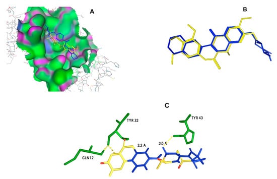 The interactions between the binding cavity residues and molecules 11419 and 11829. (A) The binding modes of molecules 11419 (yellow) and 11829 (blue). (B) The flexible alignments of compounds 11419 (yellow) and 11829 (blue). (C) The Tyr32, Tyr43, and Gln12 residues that interact with the ligands; similarities are observed in the docking positions of molecules 11419 (yellow) and 11829 (blue) with the residues (green) in the binding site. Details of the specific hydrogen bonding interactions (yellow dotted line) between the compounds and the key residues Tyr32, Tyr43, and Gln12. The bond distances (2.0 Å and 2.2 Å) reinforce the stability of the binding within the TAD cavity.