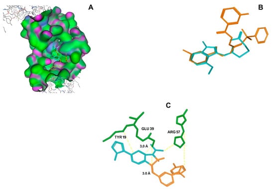 Figure 10 depicts the interactions between the binding cavity residues and molecules 10708 and 10756. Figure 10A shows the binding modes of 10708 (blue) and 10756 (orange) at the center of the binding cavity, indicating that both occupy similar positions. Figure 10B presents the flexible alignments of these molecules, highlighting the partially overlapping regions that suggest relevant structural similarities. Figure 10C illustrates the interactions (dotted lines) formed by the molecules with the binding site residues (green), emphasizing the common interactions that may play a crucial role in the biological activity within this region, and provides a detailed visualization of the hydrogen bond network formed by compounds 10708 and 10756 with the critical residues within the TAD cavity. Specifically, 10708 formed hydrogen bonds with Tyr19 and Arg57, while 10756 showed interactions with Glu39 and Tyr19. The measured bond distances (2.8 Å and 3.0 Å) support the strength of these interactions.