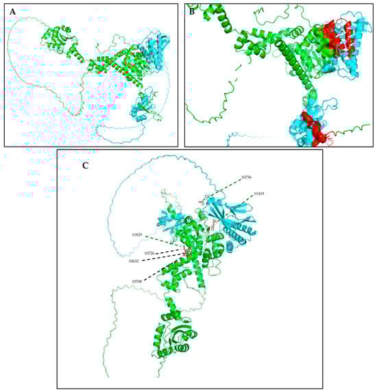The structural modeling of the HPV16 E1-E2 replication complex and analysis of the protein–ligand interactions in the E2 TAD. (A) A three-dimensional model of the HPV16 E1-E2 complex generated using AlphaFold, based on FASTA sequences retrieved from the NCBI database. The E1 protein is shown in green, and E2 in blue. The model illustrates the spatial configuration and domain interactions essential for viral replication (prediction confidence scores: pLDDT > 90, pTM = 0.62, ipTM = 0.59). (B) A close-up of the transactivation domain (TAD) of E2, highlighting the predicted binding pocket residues in red. These residues were identified as critical for compound interaction through virtual screening and structural analysis. A visualization was performed using PyMOL to assess the pocket accessibility and ligand compatibility. (C) Molecular docking simulations showing the spatial positioning of the six selected compounds within the E2 binding cavity. The compounds are labeled (10756, 11419, 10708, 11829, 10632, and 10726) and shown in stick representation. Clustered binding near the center of the cavity was observed for compounds 11829, 10632, 10726, and 10708, while compounds 11419 and 10756 were oriented more specifically within the TAD region. Compound 11419 displayed the widest binding distribution and the strongest predicted interactions, with hydrogen bond distances ranging from 2.5 to 3.5 Å.