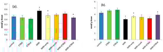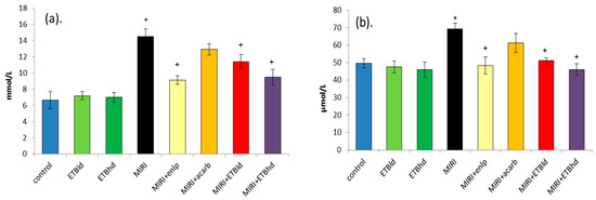 | Enzyme Activity (nmol/min/mg) | Controls | ETBld | ETBhd | MIRI | MIRI + enlp | MIRI + acarb | MIRI + ETBld | MIRI + ETBhd |