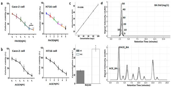 Butyrate content in the fermented samples (ACE, FACE) was measured using the Butyrate ELISA Kit (Abcam, Cambridge, MA, USA) and evaluated with a microplate reader (AMR-100; Allsheng, Hangzhou, China). Butyrate was quantified using high-performance liquid chromatography (HPLC) with a standard curve constructed from butyric acid (≥98% purity; Sigma-Aldrich, St. Louis, MO, USA). After filtering FACE and ACE using 0.22 μm syringe filters, the two fermented products were diluted with ultrapure water prepared using a Milli-Q water purification system (Millipore, Burlington, MA, USA). HPLC analysis was performed on a Prominence HPLC system equipped with a refractive index detector (RID; Shimadzu, Kyoto, Japan) using a ZORBAX Eclipse Plus C18 column (4.6 × 250 mm, 5 μm; Agilent Technologies, Santa Clara, CA, USA). The mobile phase consisted of 0.1% (v/v) phosphoric acid in ultrapure water and acetonitrile (both HPLC grade; Merck, Darmstadt, Germany), delivered at a flow rate of 1.0 mL/min. The column temperature was maintained at 35 °C, and the injection volume was set to 20 μL. Retention time for butyrate was approximately 2.8–3.0 min. Peak areas from standard solutions (5–50 mg/L) were used to construct the calibration curve. Chromatographic data were acquired and processed using LabSolutions ver. 5.97 (Shimadzu, Kyoto, Japan).