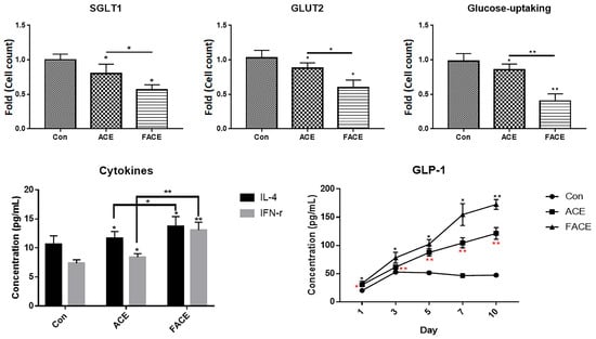 Cultured Caco-2 cells (ATCC, Manassas, VA, USA) and macrophages were exposed to various ACE and FACE concentrations (0–5 mg/mL) for 1 day. To determine appropriate ACE and FACE dosages, exposed cells were evaluated for cytotoxicity using PI-Annexin V (Thermo Fisher Scientific), a flow cytometer (BD FACSCalibur, BD Biosciences, Franklin Lakes, NJ, USA), and FlowJo 10.8.1 (BD Biosciences). Except for the GLP-1 assay and immunocytochemistry, all other experiments exposed cells to four conditions under the following time settings: 1 day of Control (Con, glucose 1.0 g/L of 5.5 mM), FACE (1.0 g/L of 5.5 mM), and high glucose (HG, 4.5 g/L of 25 mM); 1 day of FACE, followed by an additional day of HG (FACE+HG). For the GLP-1 assay and immunocytochemistry, FACE+HG was administered as a combined treatment for 10 days.