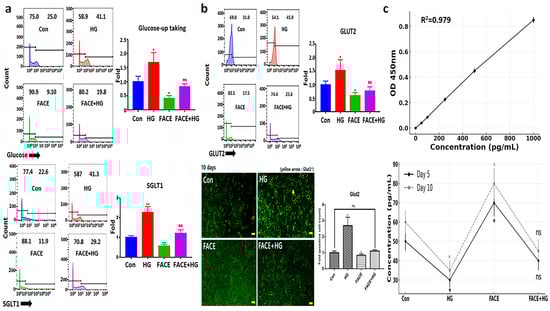 After Caco-2 cells were cultured under various conditions (Con, HG, FACE, and FACE+HG) for 10 days, they were fixed with 2% paraformaldehyde for 12 h, pretreated with Fc receptor blocker (BD Bioscience), and stained for 1 day using the FITC-GLUT2 antibody (Thermo Fisher Scientific). Stained cells were evaluated using a fluorescence microscope (Eclipse Ts-2, Nikon, Shinagawa, Japan) and counted in NIS-elementsV5.11 (Nikon).