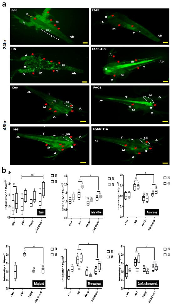 12] for 2 days. Meta-nauplii were sorted from nauplii based on negative phototaxis behavior, confirmed using a microscope (Eclipse Ts-2, Nikon, Shinagawa, Japan). Isolated nauplii split into four conditions (Con; HG, 450 μg/mL; FACE, 3 mg/mL; FACE+HG) were treated with 10 mg/mL FITC-labeled glucose (Cayman Chemical Company) for 48 h. Next, the effect of FACE was evaluated under a fluorescence microscope (Eclipse Ts-2, Nikon, Shinagawa, Japan) and NIS-elements V5.11 (Nikon). Stained cells in nauplii were counted manually.