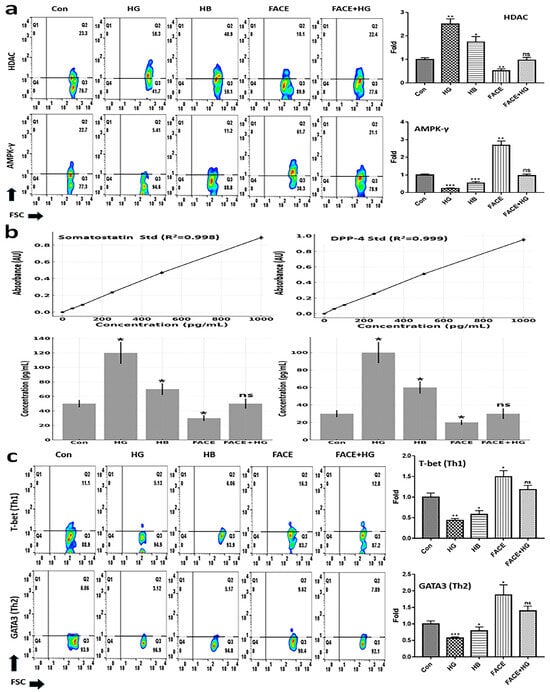 After Caco-2 cells were cultured under various conditions (Con, HG, FACE, and FACE+HG) for 1 day, they were fixed with 2% paraformaldehyde for 8 h. To investigate butyrate’s effects on expression of key intracellular markers (HDAC, histone deacetylase; AMPK-γ, AMP-activated protein kinase gamma; T-bet, T-box transcription factor TBX21; GATA3, GATA binding protein 3) involved in glucose metabolism and immune regulation, Caco-2 cells were exposed to five different conditions (Con, HG, HB, FACE, and FACE+HG). After treatment with the Fc receptor blocker reagent (BD Biosciences), cells were incubated with the FITC-GLUT2 antibody (Thermo Fisher Scientific), FITC-SGLT1 (Thermo Fisher Scientific), FITC-anti-HDAC1 (Abcam), AMPK-γ (Abcam) conjugated with the APC labeling kit (EasyLink Fluorescent Labeling Kits, Abcam), FITC-anti-T-bet (Abcam), and APC-anti-GATA3 (Abcam) for 1 day. Prior to antibody treatment for intracellular analysis, cells were pretreated with 0.02% Tween 20 (Sigma-Aldrich) for 30 min, then treated with 3 mg/mL FACE and ACE (