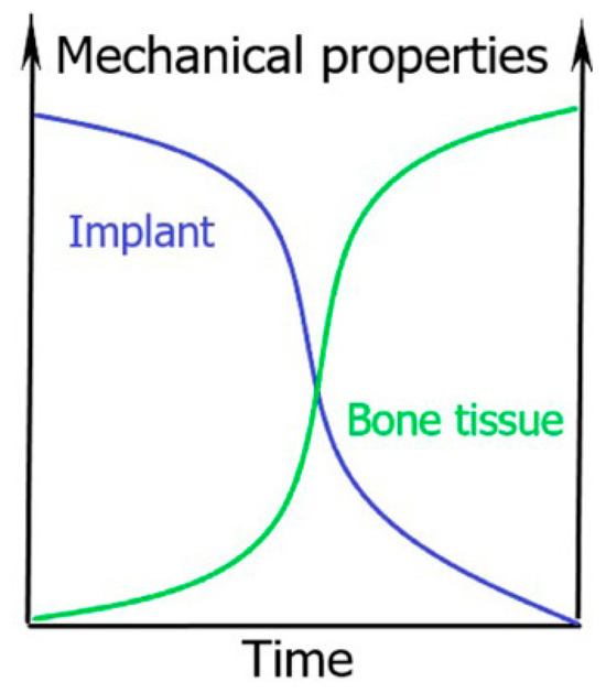 The ideal diagram represents the evolution of the implant over time (reduction of mechanical strength by degradation) simultaneously with the healing process of bone fracture [2].