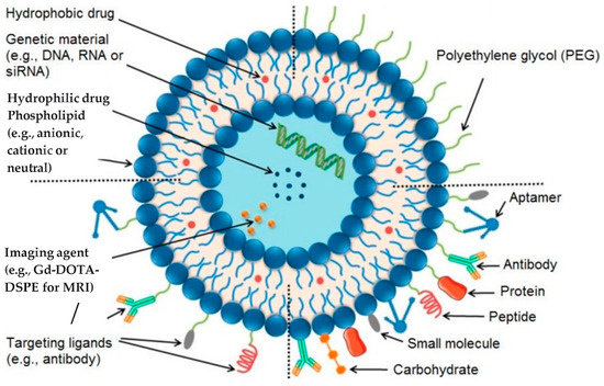 Introduced by Bangham in 1961, liposomes are models of biological membranes made from lipids. They self-assemble into spherical structures or vesicles with a polar interior designed to encapsulate polar agents, a non-polar hydrophobic lipid bilayer for loading non-polar agents, and a polar surface that can be functionalized for extended circulation or targeting. Liposomes can deliver the encapsulated drug through passive targeting or by active targeting. In passive targeting, they fuse with the biological membrane and deliver their payload. In active targeting, ligands are attached to the liposome surface to specifically recognize and bind to disease markers. A schematic representation of the different types of liposomes is presented in Figure 2. One type of liposomes is conventional liposomes. They are non-functionalized liposomes that can carry a payload (Figure 2, upper left quadrant). Another type of liposomes is PEGylated liposomes. These liposomes are coated with polyethylene glycol. They are engineered to remain in circulation for longer and are commonly referred to as “stealth” liposomes (Figure 2, upper right quadrant). A third type of liposomes is ligand-targeted liposomes. These liposomes are functionalized to target specific sites by incorporating a specific ligand to which antibodies, peptides, and proteins can bind (Figure 2, lower right quadrant). The multifunctional liposomes are the liposomes that have more functions, and they can be used for diagnostic or treatment purposes (Figure 2, lower left quadrant). These liposomes carry the desired contrast agent or drug, are long-circulating, and are functionalized to bind to the disease site specifically.