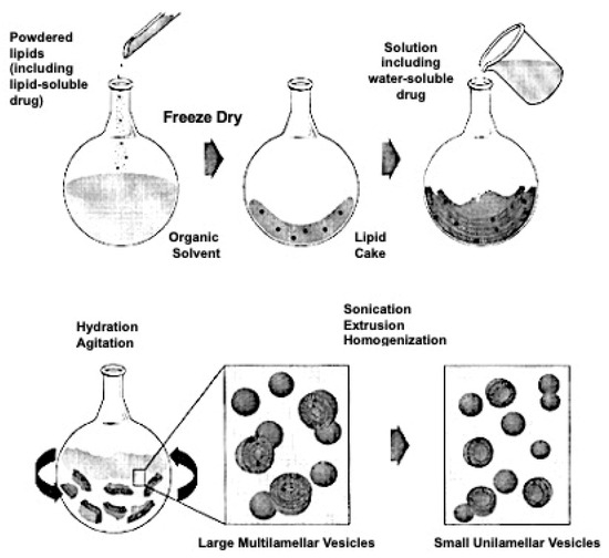 Liposomes are primarily composed of phospholipids, with additional materials added for stability, targeting, and detection. Cholesterol is often included to modify the membrane permeability. There are several ways to prepare liposomes, such as lipid film hydration, sonication, freeze-drying, solvent injection, and detergent dialysis. There are advantages and disadvantages to each preparation method. The liposomes synthesized by these different methods will be either multilamellar (sonication, freeze-drying, solvent injection, detergent dialysis) or unilamellar (lipid film hydration with extrusion). The different methods involve some common steps, such as the formation of a lipid film and the hydration of the lipid film [12]. One standard method for preparing reproducible liposomes that will render unilamellar liposomes of the same size involves the hydration of a thin lipid film followed by extrusion. The lipid film is made by evaporating the chloroform from the solution of lipids dissolved in chloroform, as illustrated in Figure 3 [12]. If the contrast agent or drug is hydrophilic, it is added during the hydration step. For hydrophobic agents or drugs, they are incorporated into the lipid solution in chloroform before forming the thin lipid film.