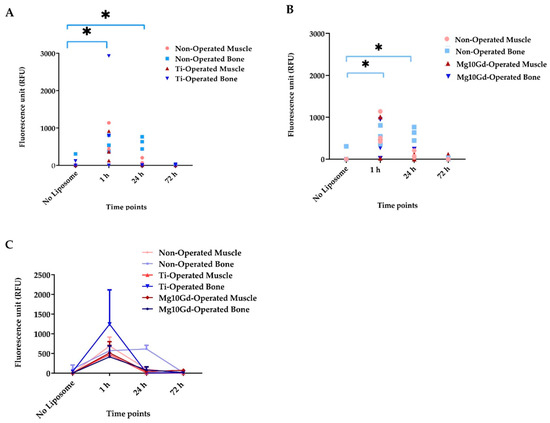 The imaging results confirmed the suitability of the liposomes in the bone-implant system, showing clearance within 72 h. Notably, only the non-operated group showed significantly high signals in the bone at 24 h compared with the other operated groups (Figure 6). The comparison between non-biodegradable (Ti) and biodegradable (Mg-10Gd) implants highlights the potential benefits of using biodegradable materials. These materials may reduce long-term complications and the need for additional surgeries to remove implants.