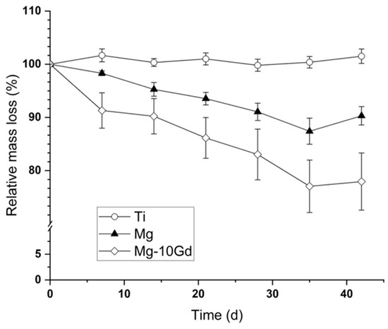 Relative mass loss of metallic implants over 42 days calculated from micro-computed tomography (μCT) observation; mean ± SEM, Ti n = 5; Mg and Mg-10Gd n = 10 [5].