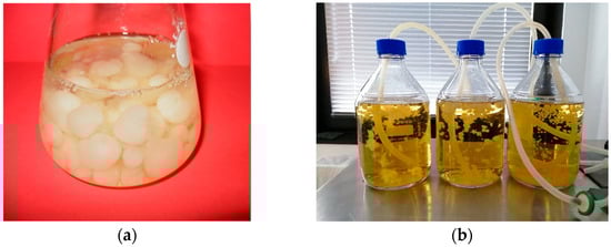 Mycelial cultures of Meripilus giganteus: (a) submerged cultures grown in liquid medium; (b) aerated cultures in air-lift bioreactors.