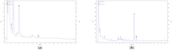 Example DAD-HPLC chromatogram of extracts cultivated under in vitro conditions. Identified compounds in methanolic extracts of mycelium: (a) 1—L-phenylalanine, 2—L-tryptophan, 3—syringic acid; identified compounds in ethanolic extracts of mycelium: (b) 1—ergosterol, 2—tocopherol.
