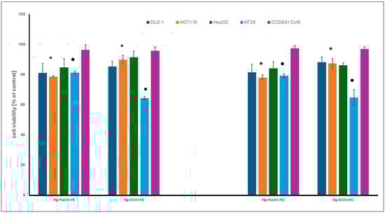 The cytotoxicity of fruiting bodies (FB) and mycelium (MYC) extracts of M. giganteus against gastrointestinal cancer and normal cell lines, at the highest tested concentration (200 µg/mL) after 48 h. The results are expressed as a percentage of viable cells relative to the control, untreated cells. The differences observed were statistically significant (p < 0.05). The asterisk (*) indicates significant differences between ethanol and methanol extracts for the HCT 116 cell line. The dot (•) denotes significant differences between ethanol and methanol extracts for the HT29 cell line. The explanation of extracts symbols and cell lines are presented in the Section 2.