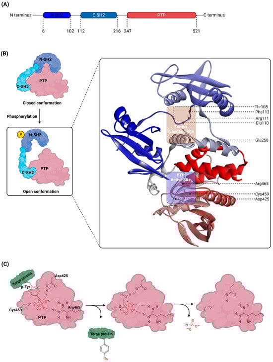 SHP2 also contains an allosteric tunnel site formed by interactions between the N-SH2, C-SH2, and PTP domains. Key residues within the tunnel allosteric site include Thr108, Phe113, Arg111, Glu110, and Glu250 [19,36]. This site plays a pivotal role in stabilizing SHP2’s autoinhibited conformation when targeted by allosteric inhibitors. The structural organization and catalytic mechanism of SHP2 are illustrated in Figure 1.
