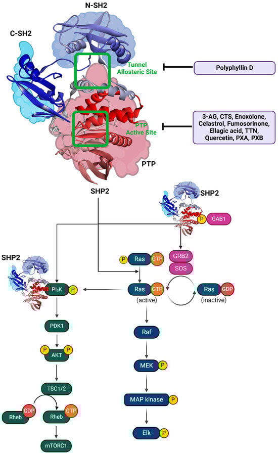 SHP2 plays a central role in the regulation of the Ras/MAPK signaling pathway, a critical cascade for cell proliferation, differentiation, and survival [37,38,39]. It functions downstream of RTKs such as EGFR, FGFR, and PDGFR, facilitating the activation of Ras, a key GTPase that transitions between an inactive GDP-bound state and an active GTP-bound state [28,30,37,39]. SHP2 enhances Ras activity by dephosphorylating inhibitory tyrosine residues, such as pY32 on Ras, which increases the stability of the GTP-bound active form [8,9]. Furthermore, SHP2 dephosphorylates GAPs (GTPase-activating proteins) such as RasA, thereby reducing their ability to inactivate Ras [9]. Additionally, SHP2 interacts with the GAB1-GRB2-SOS1 complex, promoting the guanine nucleotide exchange factor (GEF) activity of SOS1 to convert GDP-bound RAS into its GTP-bound form [40]. This sustained activation of RAS drives downstream signaling through the RAF/MEK/ERK phosphorylation cascade, connecting extracellular growth signals to nuclear transcription factors that regulate cellular processes such as proliferation and survival.