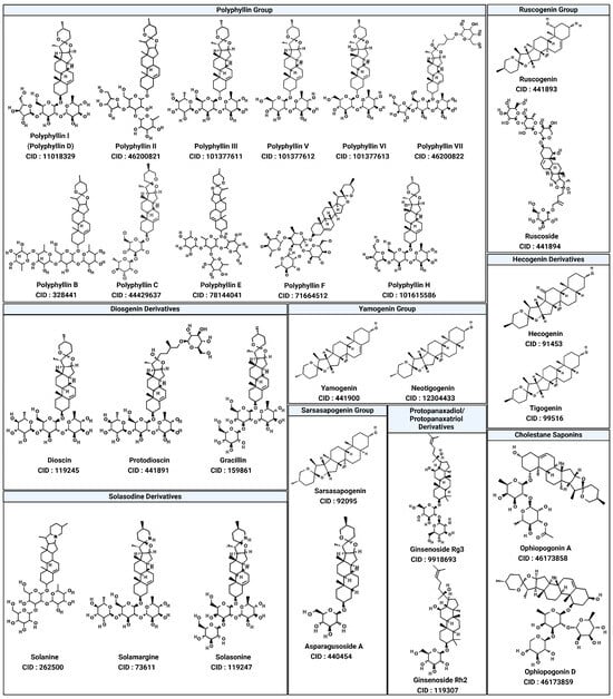 To explore this potential, 29 saponin compounds were selected for their structural diversity and bioactivities relevant to cancer therapy [67,68,69,70]. Saponins are glycosylated compounds characterized by a triterpenoid or steroidal aglycone backbone linked to sugar moieties, enabling diverse interactions with protein targets [71,72]. The compounds represent various saponin subgroups, including polyphyllin, diosgenin derivatives, ruscogenin, solasodine derivatives, yamogenin, sarsasapogenin, and cholestane saponins [73]. These compounds were selected with the aim of including a wide range of chemical scaffolds and functional groups, facilitating a comprehensive evaluation of SHP2 inhibition. All selected compounds, including polyphyllin D (CID: 11018329), polyphyllin B (CID: 328441), diosgenin (CID: 119245), and ophiopogonin D (CID: 46173859), were retrieved from the PubChem database (https://pubchem.ncbi.nlm.nih.gov/), ensuring publicly accessible chemical and structural data for this study (Figure 3; accessed on 1 March 2025).