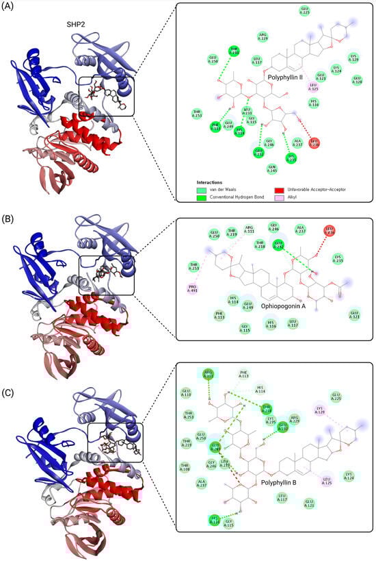 Visualization of ligand–protein interactions at the SHP2 tunnel allosteric site for polyphyllin II, ophiopogonin A, and polyphyllin B. The figure illustrates the molecular docking results for three selected saponin compounds, polyphyllin II (A), ophiopogonin A (B), and polyphyllin B (C), within the SHP2 tunnel allosteric site. The docking was performed using CB-Dock2, and the ligand–protein complexes were visualized using Discovery Studio 2024 Client. Key interactions, including conventional hydrogen bonds, van der Waals forces, alkyl interactions, and unfavorable acceptor–acceptor contacts, are highlighted. The SHP2 structure (PDB ID: 5EHR) is shown in cartoon representation, with the tunnel site residues labeled. These visualizations provide insights into the binding modes and interaction profiles of saponin compounds, emphasizing their potential as SHP2 allosteric inhibitors.