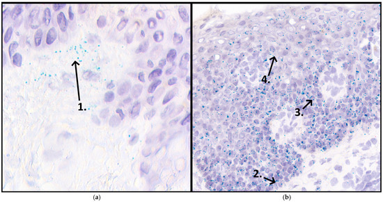 Vitamin D receptor (VDR) expression in lesional psoriasis skin after etanercept treatment, analyzed using RNAscope in situ hybridization (ISH). This image is presented as a representative illustration of the RNAscope methodology and is not intended for direct pre-post comparison or generalization. (a) The first panel highlights the dermis with the arrow (1) pointing to the area immediately beneath the dermal-epidermal junction. (b) The second panel displays arrows indicating the positions of the analyzed epidermal layers: basal layer (2), with the arrow pointing directly at the basal layer located at the dermal-epidermal junction; stratum spinosum (3), with the arrow pointing at the upper boundary of the stratum spinosum, far above the basal layer; Apical layers (4), with the arrow pointing past the stratum spinosum into the outer layers of the epidermis. The green punctate dots observed throughout the epidermis and dermis represent VDR. VDR expression was predominantly observed in the basal layer throughout the tissues.