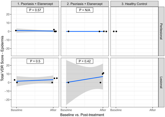 As seen in Figure 2, for P1, in perilesional skin, the mean VDR expression decreased from 1.00 at baseline to 0.40 after treatment (Estimate = −0.60; p = 0.57; n = 6). In lesional skin, the mean VDR expression increased from 1.50 at baseline to 3.33 after treatment (Estimate = 1.83; p = 0.50; n = 5).