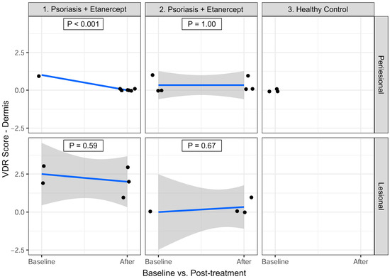 As seen in Figure 3, for P1, VDR expression in the perilesional dermis showed a significant decrease after treatment, from a mean of 1.00 at baseline to 0.00 after treatment (Estimate = −1.00; p < 0.001). In the lesional dermis, the mean VDR expression decreased slightly from 2.50 to 2.00 (Estimate = −0.50; p = 0.59).