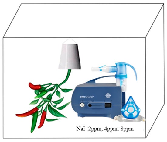 Capsicum annuum L., commonly known as chili pepper, has garnered considerable attention due to its rich nutritional value and good environmental adaptability. The various bioactive molecules it contains, such as ascorbic acid, sugars, polyphenols, carotenoids, and antioxidants [], contribute to enhanced immune function, resistance to oxidative stress, and reduced risk of chronic diseases, thus promoting human health. Notably, chili peppers have a high capacity for iodine absorption and accumulation []. Research has shown that plants mainly accumulate iodine from the environment through two primary pathways: first, by absorbing iodine from the soil via their well-developed root systems, and second, by capturing iodine from the air through their leaves []. Studies have suggested that plant leaves may have superior efficiency in absorbing exogenous iodine compared to traditional root absorption [,]. Studies have shown that iodide ions are one of the primary forms of iodine in wet deposition [,] and, also, that the environmental behavior of radioactive iodine is similar to that of non-radioactive iodine, exhibiting both bioaffinity and significant environmental mobility [,]. Based on this characteristic, this study employs non-radioactive iodine (NaI) as a surrogate for radioactive iodine to investigate its translocation and transformation in plants. The findings will provide a theoretical basis for assessing the ecological risks posed by radioactive iodine.