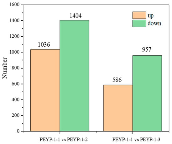 This study first screened and quantified the upregulated and downregulated gene expressions. As shown in Figure 2, comparing PEYP-1-1 with PEYP-1-2, a total of 2440 differentially expressed genes were identified, of which 1036 genes were upregulated, and 1404 genes were downregulated. When comparing PEYP-1-1 with PEYP-1-3, 1543 differentially expressed genes were identified, with 586 genes upregulated and 957 genes downregulated.