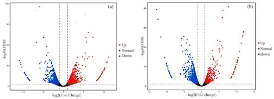 Volcano maps of differential gene expression. Note: (a) PEYP-1-1 vs. PEYP-1-2; (b) PEYP-1-1 vs. PEYP-1-3. The iodine exposure concentrations for the PEYP-1-1, PEYP-1-2, and PEYP-1-3 treatment groups were 2 ppm, 4 ppm, and 8 ppm, respectively. The horizontal axis represents the log2 (Fold Change), illustrating the difference in fold change, and the vertical axis represents the −log10 (FDR), illustrating the false discovery rate. Among them, the red dot represents the upregulated gene, the gray dot represents the gene with no significant difference, and the blue dot represents the downregulated gene.
