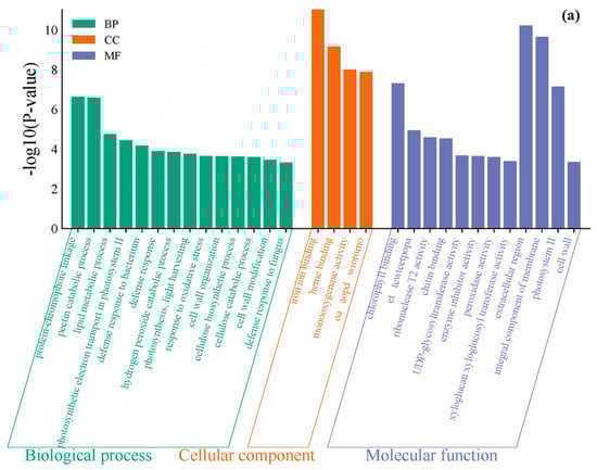 In the GO functional enrichment analysis for PEYP-1-1 vs. PEYP-1-2 (Figure 4a), significant enrichment of GO terms was observed in the molecular function category, specifically in “iron ion binding”. Iron ions play a crucial role in plants by promoting growth, enhancing stress resistance, and participating in photosynthesis, which is essential for plant physiological functions and growth processes.